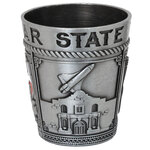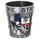 This colorful pewter shot glass showcases bold Texas imagery and Lone Star accents. Sturdy and eye-catching, it is perfect for collectors or celebrations. A standout addition to any Texas-themed barware. 2" tall, 1 3/4" in diameter