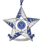 This Bullock Museum star ornament features detailed blue and silver artwork with a central emblem engraved with the iconic star on one side and Texas Under One Roof on the reverse. Finished with a coordinating blue ribbon, it serves as a meaningful keepsake for collectors and Texas history admirers. It is an elegant addition to any holiday display or souvenir collection.